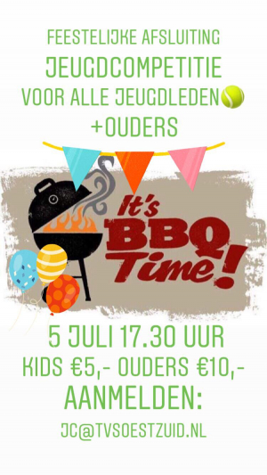 Ter afsluiting van de voorjaarscompetitie organiseert de Jeugdcommissie TV Soest Zuid op 5 juli een BBQ voor ALLE jeugdleden van TV Soest Zuid!.