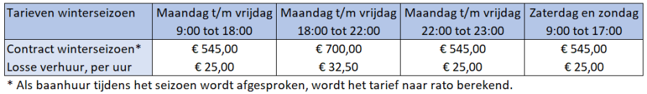 De huur voor het winterseizoen 2026/2027 loopt van maandag 28-09-2026 t/m zondag 28-3-2027. Voor doordeweekse ochtenden is de verhuurperiode vier weken langer, namelijk van maandag 14-9-2026 t/m vrijdag 9-4-2027.